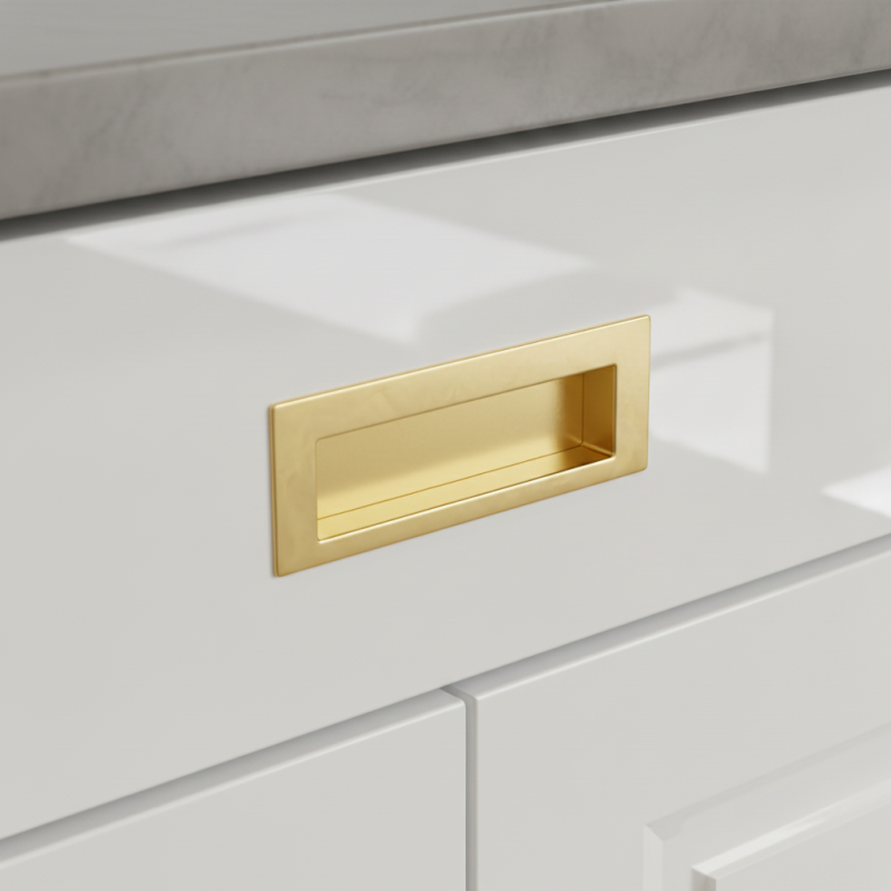 Eleganter minimalistischer Griff, der zum Einfräsen in die Oberfläche von Türen oder Schubladen bestimmt ist. Die glänzende goldene Ausführung wirkt luxuriös und modern, weshalb sie die ideale Wahl für Premium-Innenräume, Designerküchen und hochwertige Möbel ist.