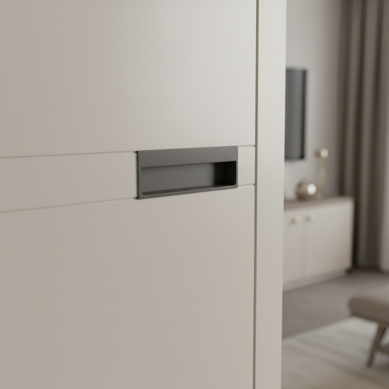Moderne eingelassener Griff TALIA in attraktiver anthrazit matter Oberflächenbehandlung ist die ideale Lösung für minimalistische und elegante Möbel. Das Einlassen in die Front der Schublade oder Tür schafft eine saubere, ungestörte Linie, die professionell und designorientiert wirkt. Passt perfekt in Küchen, Bäder, Ankleidezimmer und Wohnwände.