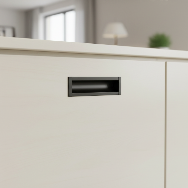 Moderne minimalistische Griffleiste zur Fräsung in die Fläche von Türen oder Schubladen. Die elegante matte schwarze Oberfläche verleiht den Möbeln ein sauberes und modernes Aussehen.