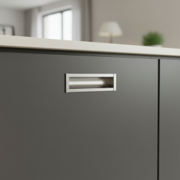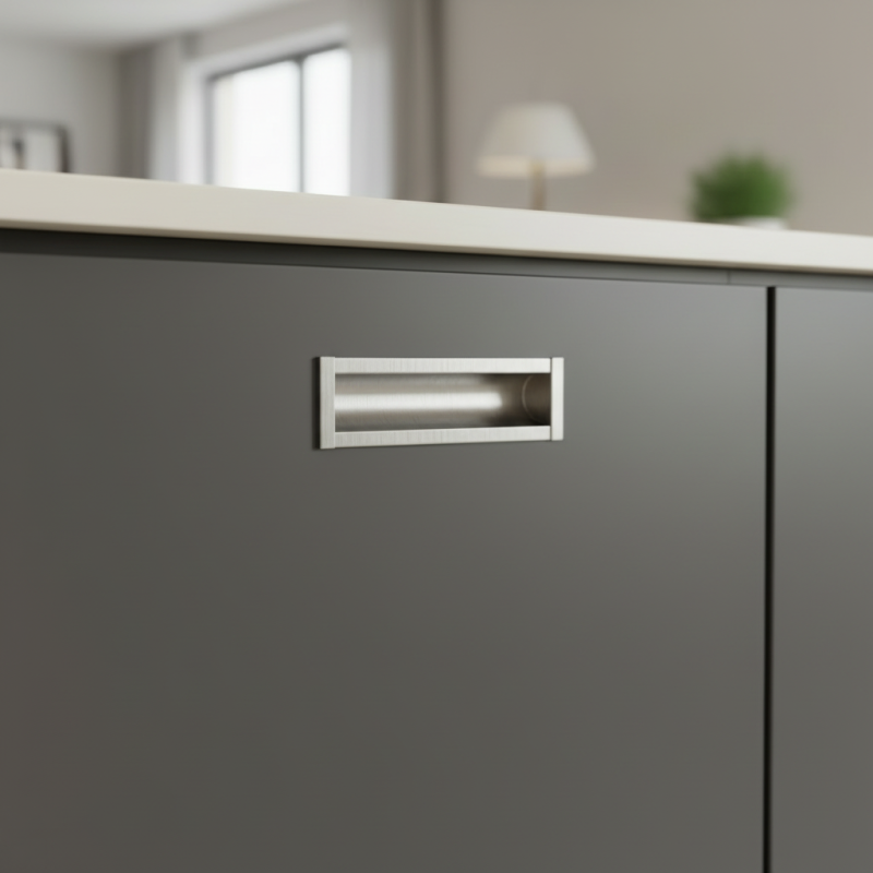 Der Griff wird in eine gefräste Öffnung in der Fläche von Türen oder Schubladen eingesetzt.