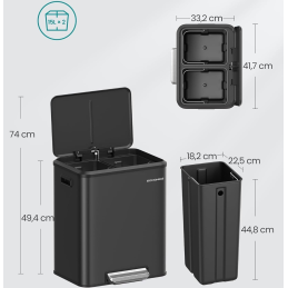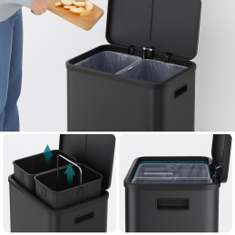 Der Eimer besteht aus hochwertigem, rostfreiem Stahl mit einer fingerabdruckresistenten Oberfläche, die leicht sauber zu halten ist. Die Inneneimer bestehen aus widerstandsfähigem, hitzebeständigem PP-Kunststoff, sind vollständig herausnehmbar und abwaschbar.