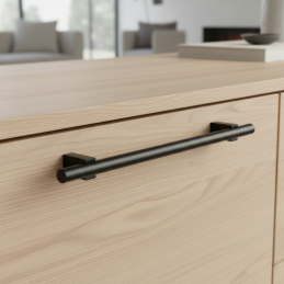 Der Griff ZAIRA in der Ausführung schwarz matt bringt ein markantes, modernes und industriell wirkendes Designelement, das an jedem Möbelstück hervorsticht. Seine charakteristische, leicht strukturierte Oberfläche verleiht dem Griff ein originelles Aussehen und verbessert gleichzeitig den Griffkomfort. Dank der eleganten, kantigen Form und der...