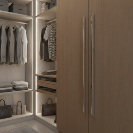 Eleganter Kleiderschrankgriff HANNA in der Ausführung glänzendes Chrom ist ein markantes Designelement für moderne Kleiderschränke und hohe Türen. Seine schlanke, minimalistische Form mit einer feinen Biegung im Winkel von 45° sorgt für ein klares, architektonisches Erscheinungsbild und gewährleistet gleichzeitig einen bequemen Griff.