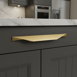 Die gebürstete goldene Oberfläche verleiht dem Griff ein exklusives Aussehen, das hervorragend mit Holz, weißen Flächen und matten Dekorplatten harmoniert.