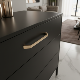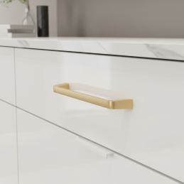 Der Griff SAMARA in gebürsteter Goldoberfläche stellt ein elegantes und zeitloses Designelement dar, das den Möbeln ein luxuriöses, aber dennoch dezentes Aussehen verleiht. Seine leicht abgewinkelte Form wirkt sanft und harmonisch, wodurch er sich leicht mit modernen sowie klassischeren Interieurs kombinieren lässt. Die gebürstete Goldausführung erzeugt einen warmen Metallton mit einem dezenten matten Effekt, der auf Holz-, lackierten und dunklen Flächen besonders schön zur Geltung kommt.
