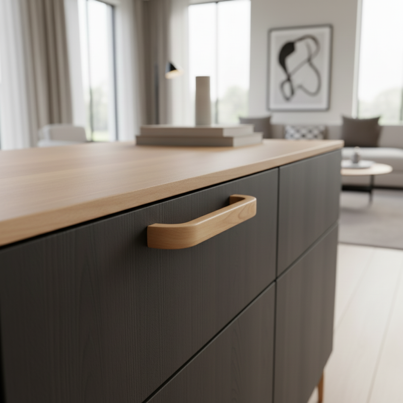 Der Holzgriff MIA in der Ausführung Buche lackiert ist ein stilvolles und zeitloses Accessoire für Möbel in der Küche, im Bad, Wohnzimmer oder Flur. Er wird aus massivem Buchenholz gefertigt und mit transparentem Lack behandelt, der die feine Maserung der Buche hervorhebt und die Oberflächenbeständigkeit erhöht.