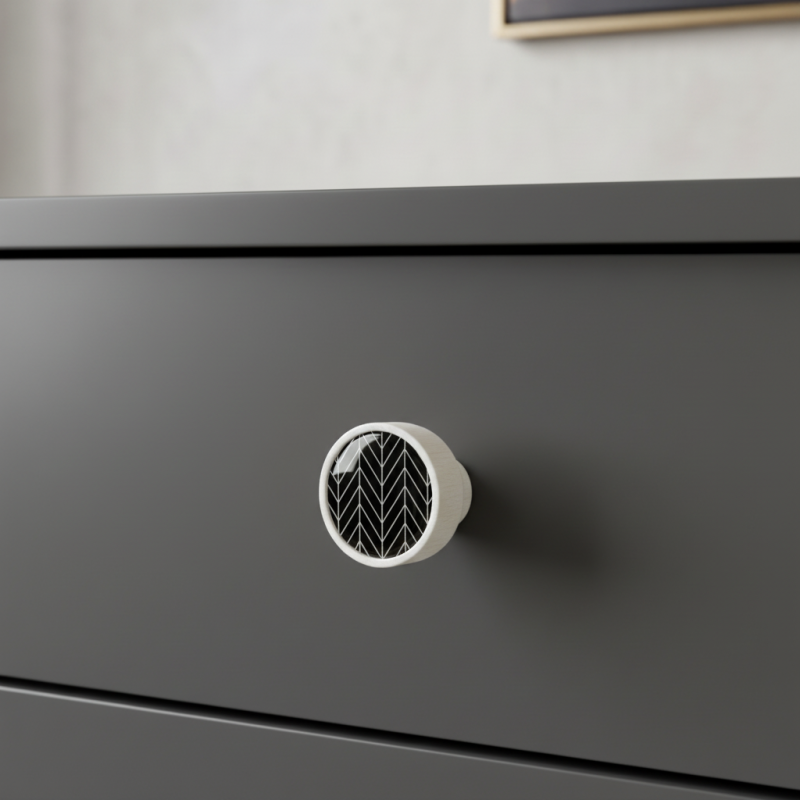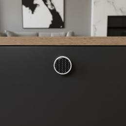 Der Holzknopf ARSIA in matter weißer Ausführung mit markantem Motiv der schwarzen Tanne ist ein modernes und elegantes Accessoire, das sich hervorragend in skandinavische, minimalistische sowie natürliche Interieurs einfügt. Der Kontrast zwischen dem weißen Holzkörper und dem schwarzen grafischen Muster schafft ein zeitloses Design, das jedes Möbelstück aufwertet.