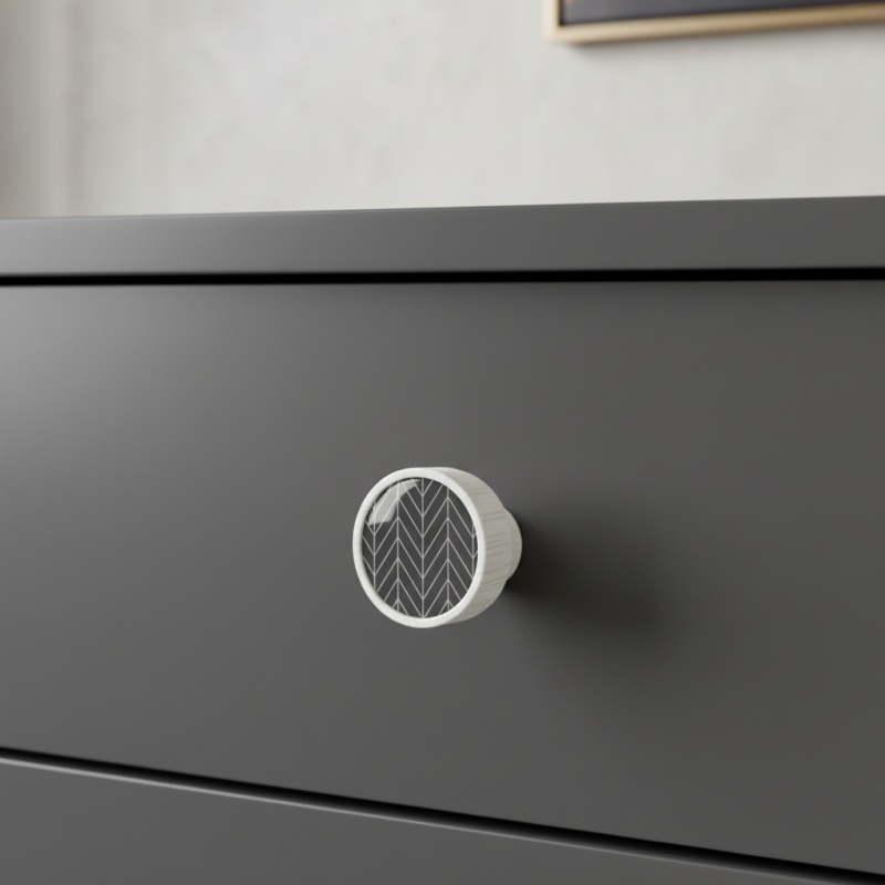 Der Holzgriff ARSIA in weißer Ausführung mit grauem Tannenmotiv ist ein modernes und elegantes Accessoire, das dem Interieur Sanftheit, Reinheit und einen natürlichen Touch verleiht. Die Kombination aus massivem Buchenholz und widerstandsfähigem weißen Lack wirkt zeitlos, während das minimalistische Baummotiv in Grautönen dem Griff einen stilvollen, skandinavischen Charakter verleiht.