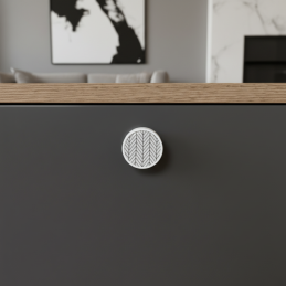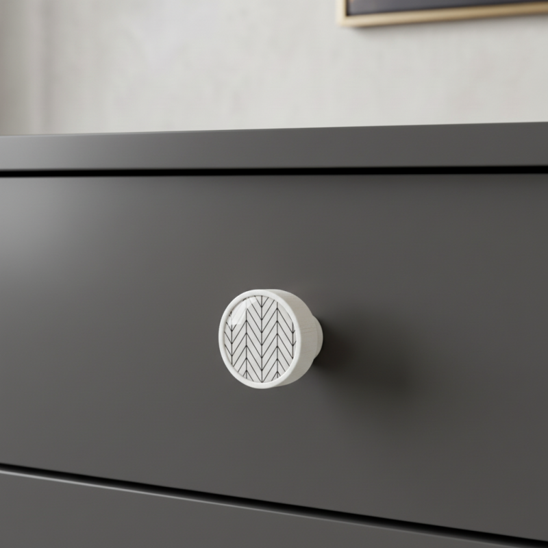 Holzgriff ARSIA in matter weißer Ausführung mit minimalistischem Motiv der weißen Tanne ist die ideale Ergänzung für moderne, skandinavische und naturbetonte Innenräume. Hergestellt aus massivem Buchenholz und lackiert in reinem Weiß wirkt er elegant, harmonisch und verleiht den Möbeln einen dezenten, natürlichen Akzent.