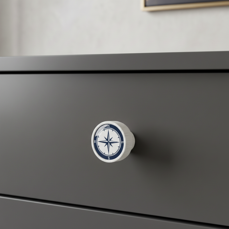 Holzgriff ARSIA in weißer Ausführung mit Kompassmotiv ist das perfekte Accessoire für alle, die Reisen, Abenteuer und originelle Designs lieben. Massives Buchenholz, überzogen mit widerstandsfähigem weißem Lack, wirkt sauber und modern, während die Kompassrose dem Griff einen einzigartigen thematischen Charakter verleiht.