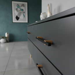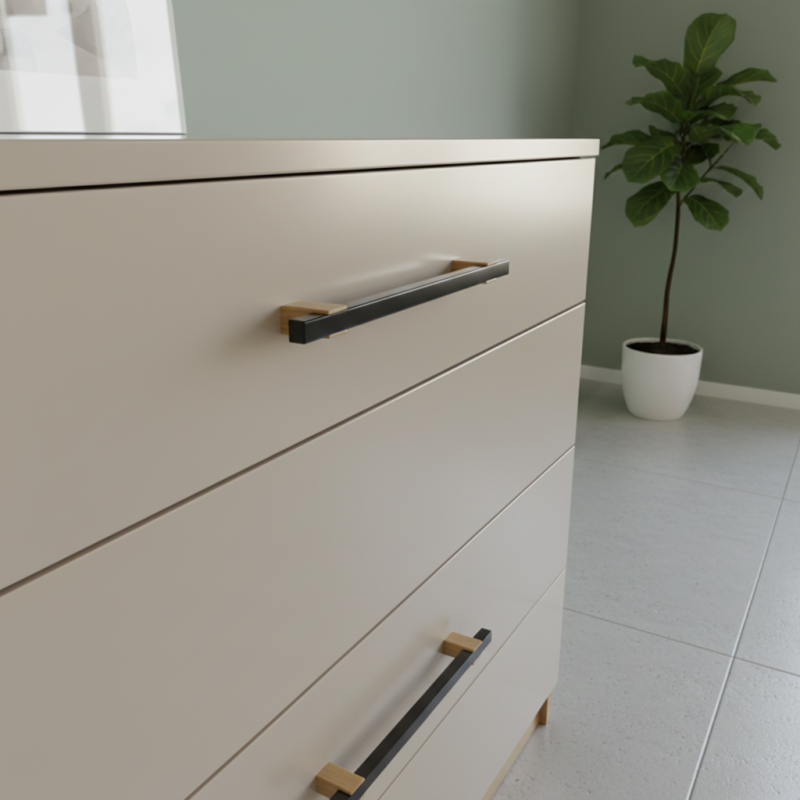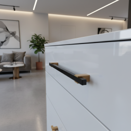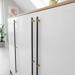 Eleganter Griff in 2 Farben kombiniert und in 3 Größen erhältlich. Die Gesamtlänge des Griffs für jeden Lochabstand ist wie folgt: Teilung 160 mm - Gesamtlänge 180 mm Teilung 256 mm - Gesamtlänge 276 mm Teilung 384 mm - Gesamtlänge 404 mm