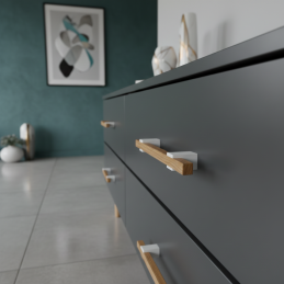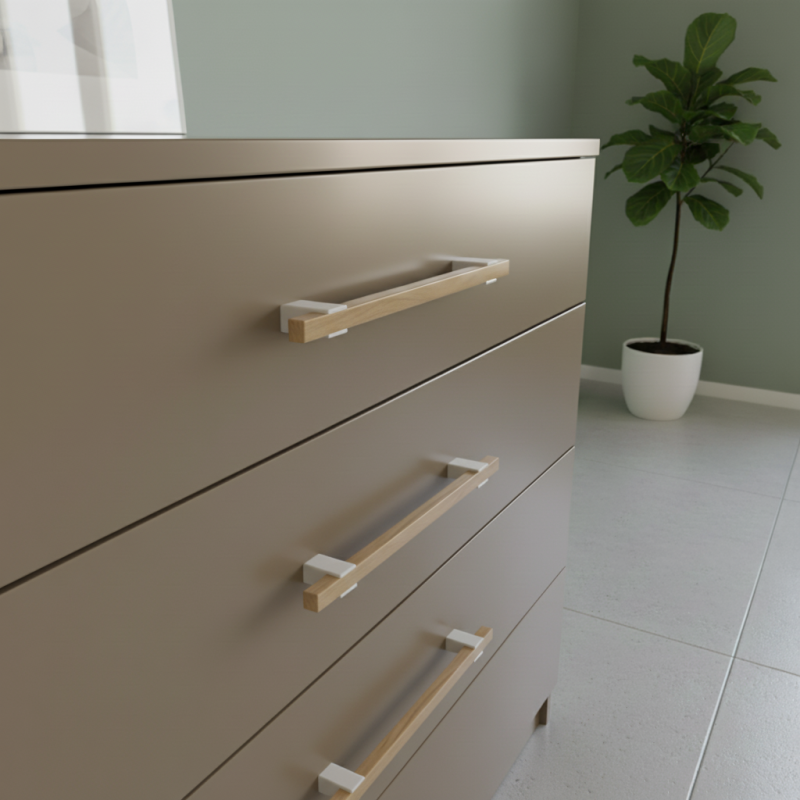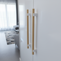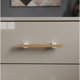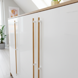 Der Holzgriff LEO in Kombination aus naturbelassenem Buchenholz und weißen matten Holzendstücken wirkt besonders modern und gemütlich. Dank seiner minimalistischen Form und den natürlichen Materialien ist er die ideale Wahl für skandinavische, Kinder- und moderne Innenräume.