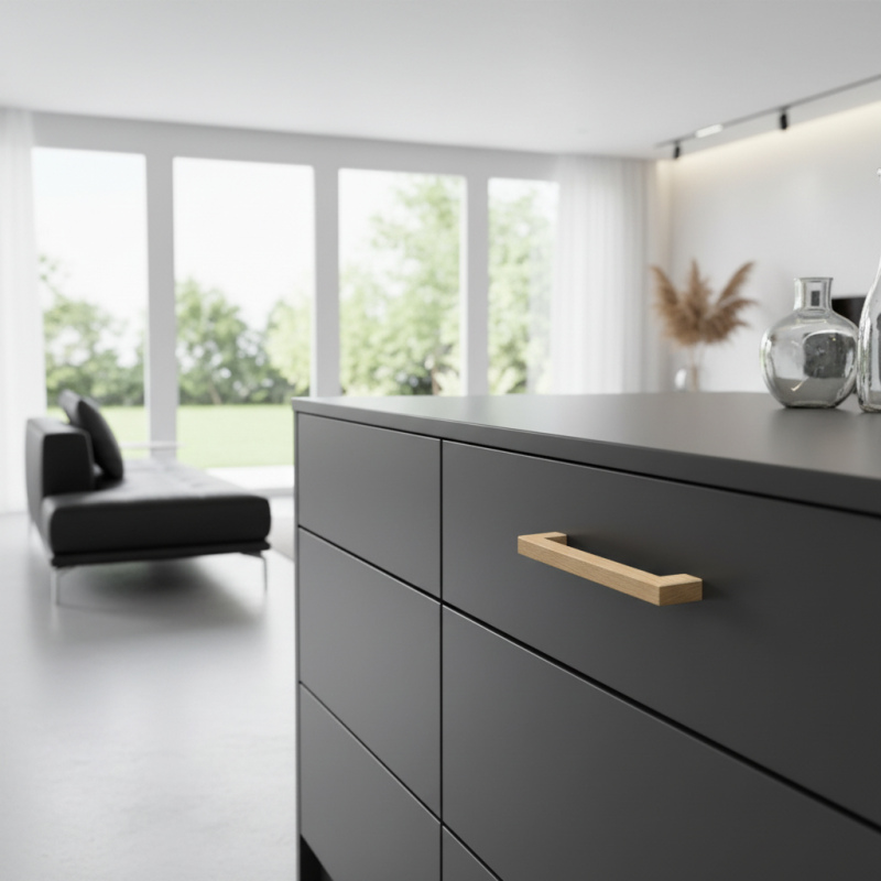 Der Holzgriff NOLA in lackierter Eiche ist eine moderne, minimalistische Lösung für Küchen, Bäder, Kommoden oder Büromöbel. Er ist aus hochwertiger massiver Eiche gefertigt und mit transparentem Lack behandelt, der die natürliche Maserung des Holzes hervorhebt und gleichzeitig die Oberfläche zuverlässig vor Beschädigungen und Feuchtigkeit schützt.