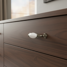 Dank der ergonomischen Form ist der Griff bequem zu benutzen und sein zeitloses Aussehen eignet sich für Küchen, Esszimmer, Kommoden oder rustikale Innenräume. Das Porzellandetail wirkt elegant und mildert angenehm die Metallbasis.