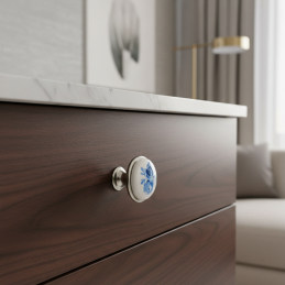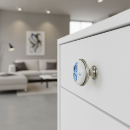Eleganter Möbelknopf ORIENT aus Porzellan mit zartem Motiv einer blauen Rose ist das ideale Accessoire für Interieurs im provenzalischen, Vintage- oder romantischen Stil. Die Kombination aus Porzellan und Metallbasis wirkt geschmackvoll und zeitlos.