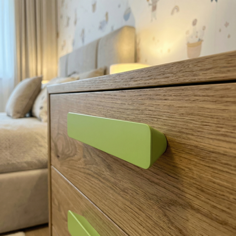 Der Griff VENUS in Pistaziengrün verleiht Ihren Möbeln ein verspieltes, aber dennoch elegantes Aussehen und schafft eine angenehme Atmosphäre in jedem Raum.
