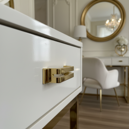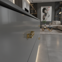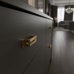 Moderner Kunststoffgriff MAURICIUS in luxuriöser goldener Oberflächenbehandlung ist ein elegantes Accessoire für moderne sowie minimalistische Innenräume. Glatte Linien, geometrisches Design und hochglänzende Verarbeitung verleihen den Möbeln ein exklusives Aussehen ohne unnötige Überladung.
