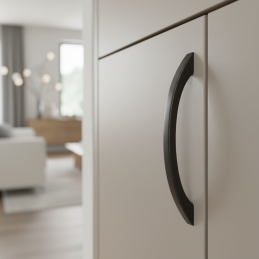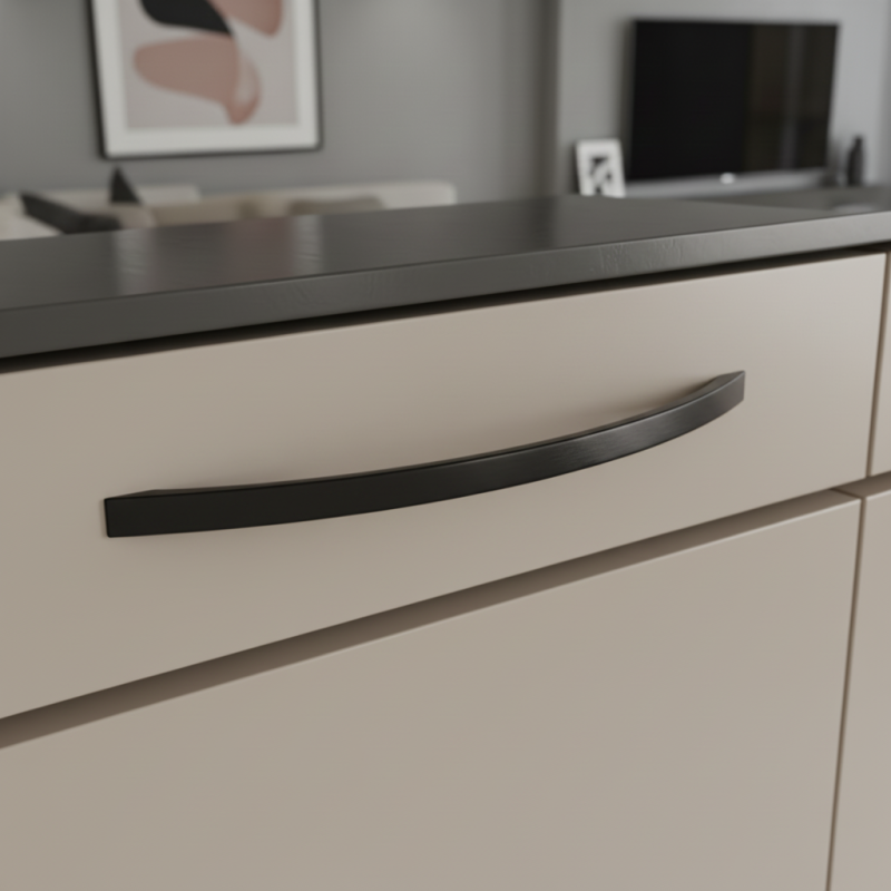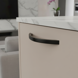 Eleganter Griff EMILIO in modernem Design schwarz matt ist das ideale Accessoire für Designküchen, Bäder oder Wohnzimmermöbel. Das sanft gebogene Profil verleiht den Möbeln Leichtigkeit und sorgt für angenehme Ergonomie beim Greifen.