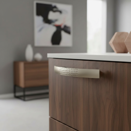 Matter Nickel ist eine beliebte Wahl für moderne Innenräume – er ist elegant, dezent und praktisch. Der Griff VELLEN in dieser Ausführung unterstreicht das klare Design der Möbel und verleiht ihnen einen feinen technischen, aber zugleich harmonischen Look.