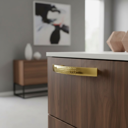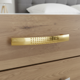 Der Griff VELLEN in glänzender goldener Ausführung verleiht Ihren Möbeln einen Hauch von Luxus und Exklusivität. Seine sanft geschwungene Form in Kombination mit der dekorativen Struktur aus kleinen Punkten schafft ein markantes, aber dennoch elegantes Designelement, das sowohl für moderne als auch glamouröse Innenräume geeignet ist.