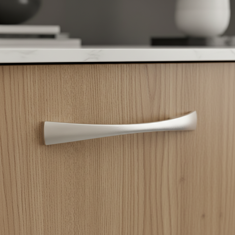 Der Griff SIMPLO in der Ausführung mattes Chrom ist das ideale Accessoire für moderne, minimalistische und klassische Innenräume. Die sanft gebogene Form wirkt elegant und leicht, während die matte Chromoberfläche einen zeitlosen, vollkommen universellen Look schafft, der sowohl zu hellen als auch zu dunklen Möbeldekoren passt.