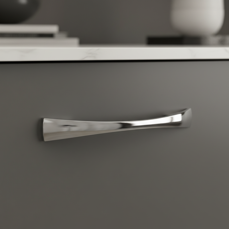 Der Griff SIMPLO in glänzender Chromausführung verleiht ein klares, modernes und zeitloses Aussehen, das Küchen-, Bad- und Wohnzimmermöbel perfekt ergänzt. Seine leicht gebogene Form wirkt elegant und verleiht dem Möbel in Kombination mit dem hohen Glanz einen frischen und luxuriösen Effekt.