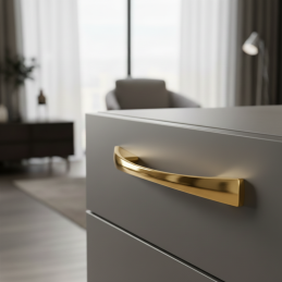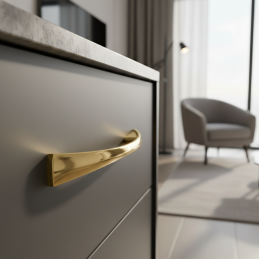 Der Griff SIMPLO in glänzender goldener Ausführung ist ein stilvolles Accessoire, das Möbeln einen eleganten und exklusiven Charakter verleiht. Seine sanft gebogene Form wirkt angenehm und dezent, während die glänzende goldene Oberfläche einen ausgeprägten Premium- und Luxuseffekt hinzufügt – ideal für Innenräume, die schon auf den ersten Blick beeindrucken wollen.