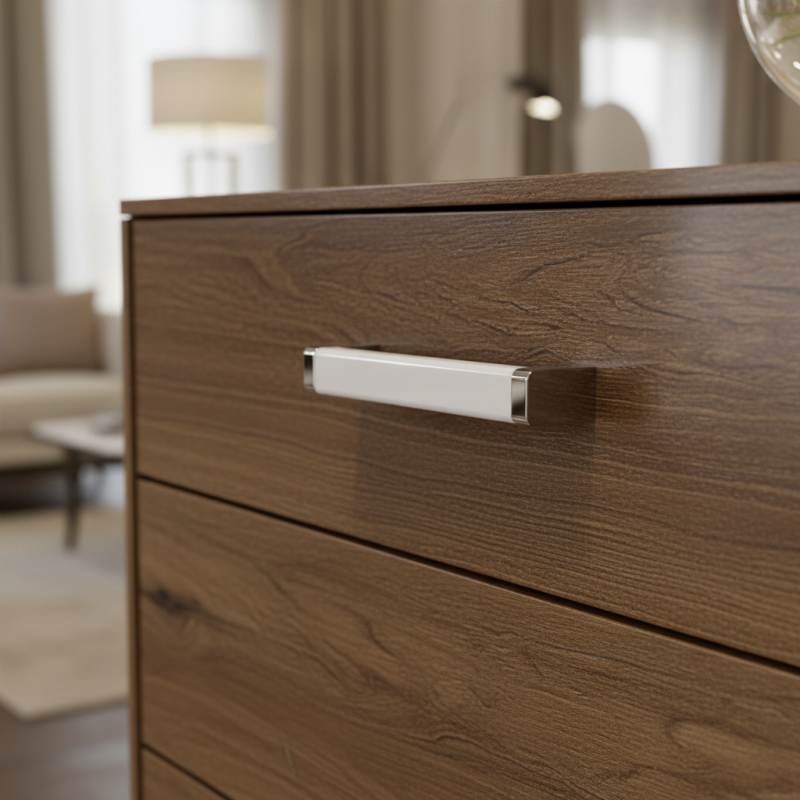 Dieser Designgriff verbindet die Eleganz von Stahl mit der Praktikabilität von Kunststoff zu einem modernen Accessoire, das jedes Möbelstück aufwertet. Dank seiner hochwertigen Materialien ist er langlebig, angenehm in der Haptik und für den täglichen Gebrauch geeignet.