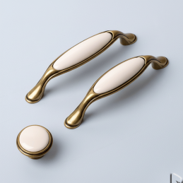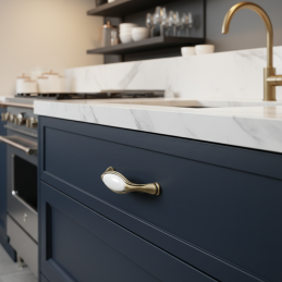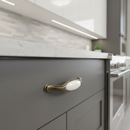 Der Griff RITA in der Oberflächenbehandlung Altgold ist ein zeitloses dekoratives Element, das klassische, ländliche und romantische Innenräume perfekt ergänzt. Seine Form ist in einem dezent historisierenden Stil gehalten und der mittlere Teil aus glänzendem weißem Porzellan verleiht dem Griff ein luxuriöses und sauberes Aussehen.