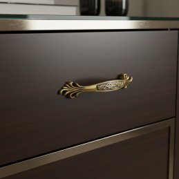 Der elegante Möbelgriff KAMILA in der Ausführung Altmessing ist ein stilvolles Accessoire für klassische, rustikale und Vintage-Möbel. Die dekorativen Details und die dezent patinierte Oberfläche verleihen den Möbeln einen luxuriösen und zeitlosen Charakter.