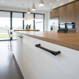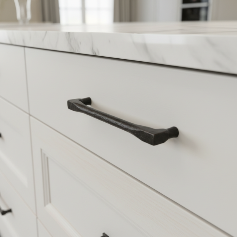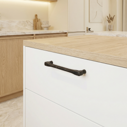 Der Metallgriff TAMPA in der Ausführung Alt-Schwarz besticht durch sein leicht patiniertes, handgearbeitet wirkendes Aussehen. Die Oberflächenbehandlung mit Abnutzungseffekt verleiht den Möbeln einen authentischen rustikalen Charakter und passt hervorragend zu industriellen, Vintage- sowie klassischen Interieurs.