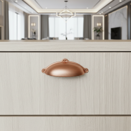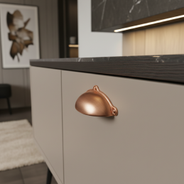 Der Griff MELANIE in elegantem Kupferdesign ist ein außergewöhnliches Designelement, das Ihren Möbeln ein warmes, stilvolles und zeitloses Aussehen verleiht. Die abgerundete „Schalen“-Form des Griffs sorgt für ein angenehmes Greifen und bringt gleichzeitig einen dezenten Retro-Touch, der im Kupferton zu einem markanten dekorativen Element wird.
