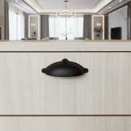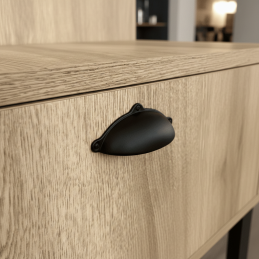 Der Griff MELANIE in modernem mattschwarzem Design ist ein elegantes und zeitloses Accessoire für Kommoden, Schränke, Küchenmöbel oder Schubladen. Seine ikonische „Schalen“-Form bietet einen besonders bequemen Griff und verleiht den Möbeln gleichzeitig einen stilvollen Retro-Touch, der in mattem Schwarz besonders modern und raffiniert wirkt.