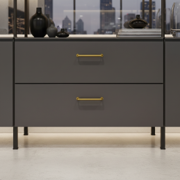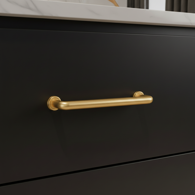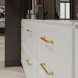 Der Griff NURIA in der Ausführung gebürstetes Gold verleiht dem Interieur einen luxuriösen und zugleich modernen Ausdruck. Seine glatten, abgerundeten Linien, ergänzt durch dezente Ringe an den Enden, wirken raffiniert und zeitlos. Gebürstetes Gold erzeugt einen eleganten, warmen Farbton, der perfekt zu weißen, dunklen und natürlichen Möbeln passt.