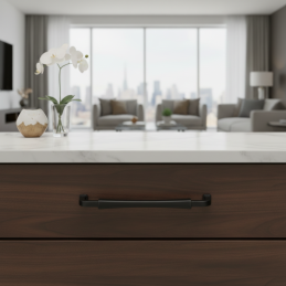 Die ergonomische Form sorgt für einen bequemen Griff, was ihn zur idealen Wahl für Küchen, Flure, Bäder und Wohnwände macht. Die schwarze, matte Oberfläche ist widerstandsfähig, pflegeleicht und passt perfekt in modernes Wohnen.