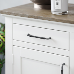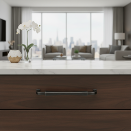 Griff NEUS in der Ausführung schwarze Patina verbindet traditionelle Form mit moderner patinierter Oberfläche, die den Möbeln einen einzigartigen handwerklichen Charakter verleiht. Der sanft gebogene Griff und die dekorativen Enden schaffen eine elegante Silhouette, die sich hervorragend für klassische, industrielle und rustikale Innenräume eignet.