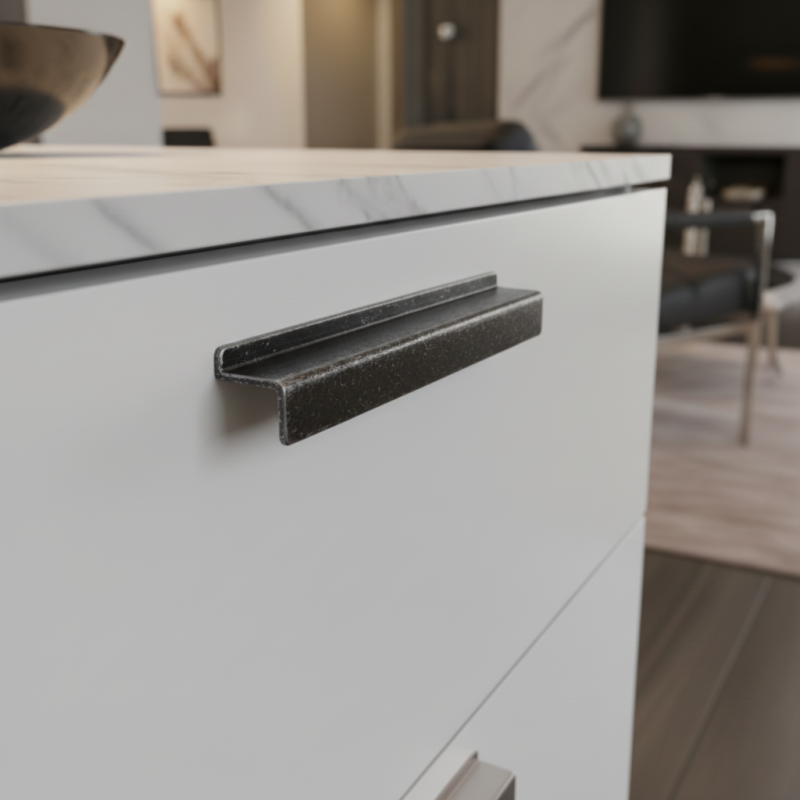 Der Griff BRUNA in der Ausführung schwarze Patina vereint eine moderne minimalistische Form mit einer markanten dekorativen Oberfläche, die den Möbeln einen einzigartigen Charakter verleiht. Es handelt sich um einen L-Griff, der zur Montage an der oberen Kante von Türen oder Schubladen bestimmt ist, was das Öffnen ohne klassische sichtbare Griffe ermöglicht. Das Ergebnis ist ein sauberes und elegantes Erscheinungsbild der Möbel.