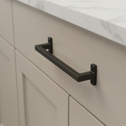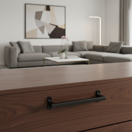 Griff REBECA in der Ausführung schwarz matt ist ein modernes und markantes Möbelaccessoire, das rustikale Elemente perfekt mit minimalistischem Design verbindet. Die klaren, eckigen Linien und die stabile Konstruktion wirken zeitlos, während die matte schwarze Oberfläche dem Griff ein luxuriöses, markantes und zugleich universelles Aussehen verleiht.