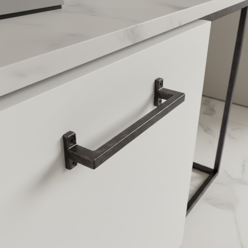 Der Griff REBECA in der Ausführung schwarze Patina verleiht dem Interieur einen einzigartigen Charakter, der rustikalen Stil mit industriellem Flair verbindet. Seine kantige Form ist stabil, zeitlos und ästhetisch klar, während die Oberflächenbehandlung in schwarzer Patina den Eindruck einer natürlichen Alterung des Metalls erzeugt. Dieser Effekt verleiht den Möbeln Tiefe, authentisches handwerkliches Aussehen und eine angenehme visuelle Rauheit.