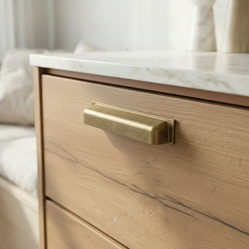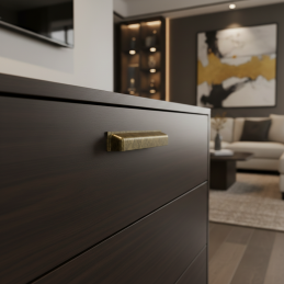 Die Oberfläche Altmessing passt hervorragend zu Massivholz, Furnier und dunkleren Dekoren und bietet gleichzeitig praktische Widerstandsfähigkeit im täglichen Gebrauch.