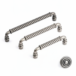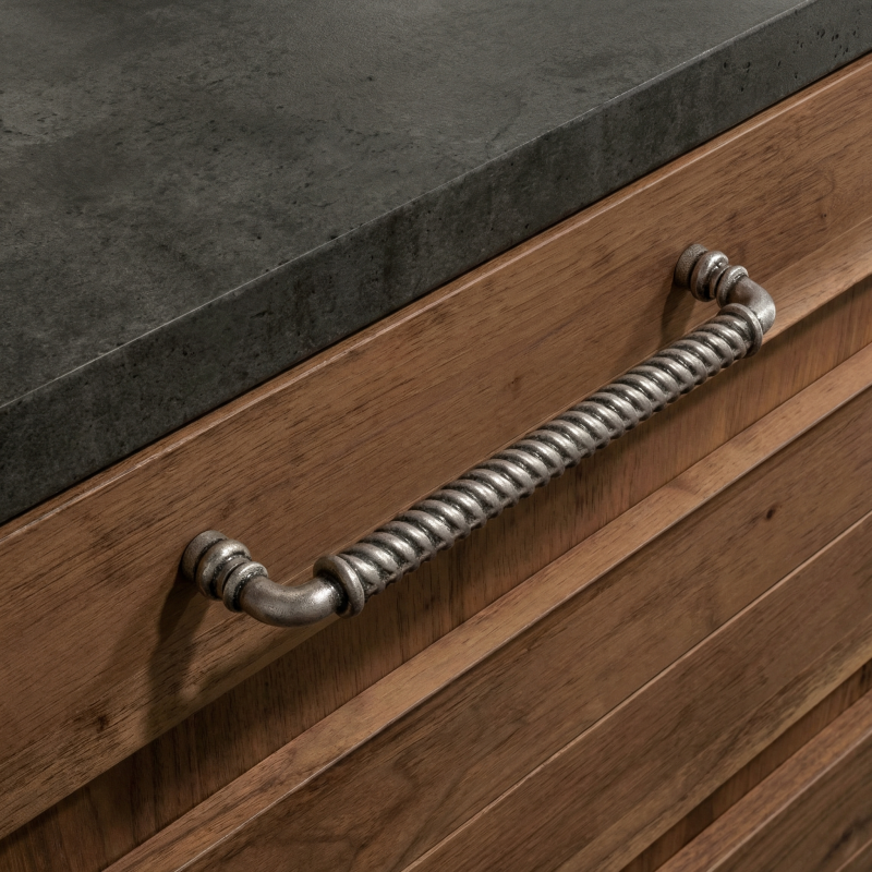 Rustikale Möbelgriff Griff ROXOR in der Oberflächenbehandlung Alt-Silber ist ein markantes dekoratives Element, das den Möbeln einen traditionellen und eleganten Charakter verleiht. Der typische gedrehte Körper des Griffs in Kombination mit der patinierten Optik erzeugt einen authentischen rustikalen Eindruck, ideal für ländliche, klassische oder historisch gestaltete Innenräume.