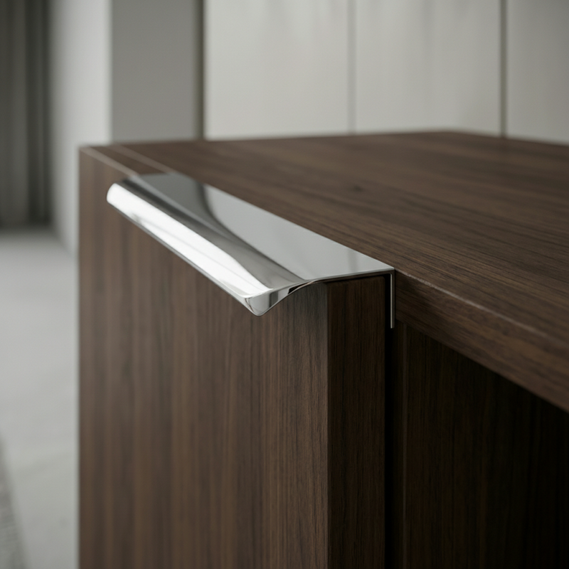 Eleganter Griff für die Türkante AVANTI in glänzendem Chrom ist die ideale Lösung für moderne und zeitlose Innenräume. Er wird an der oberen Kante von Türen oder Schubladen montiert, wodurch die saubere Optik der Möbelvorderseite erhalten bleibt und der minimalistische Charakter unterstrichen wird.