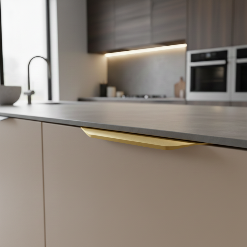 Der Griff ALICANTE in modernem Design gebürstetes Gold ist eine elegante Lösung für Möbel, bei denen ein klares und minimalistisches Design Priorität hat. Er wird von der Rückseite der Tür montiert, sodass aus der Frontansicht keine Schrauben sichtbar sind, was ein perfektes ästhetisches Ergebnis garantiert.