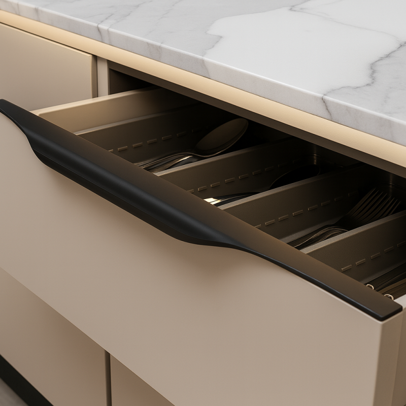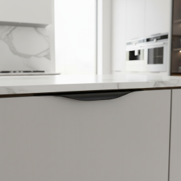Eleganter eingefräster Griff LUTRA in der Ausführung schwarz matt ist eine moderne und praktische Lösung für alle Möbeltypen. Er wird direkt in die Kante von Türen oder Schubladen eingesetzt und sorgt so für ein minimalistisches und sauberes Erscheinungsbild ohne hervorstehende Elemente. Der Griff besteht aus hochwertigem Aluminium und hat eine fein gebürstete Oberfläche.