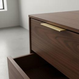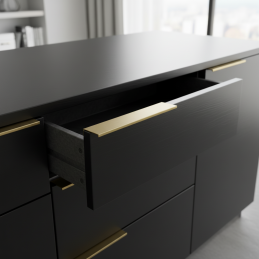 Moderner minimalistischer Griff CANSAS ist zur Montage an der Kante von Türen oder Schubladen bestimmt. Die elegante gebürstete goldene Oberfläche verleiht den Möbeln ein luxuriöses Aussehen, wirkt aber gleichzeitig dezent und zeitlos. Die ideale Wahl für moderne Küchenzeilen, Kleiderschränke, Badezimmerschränke oder Designermöbel.