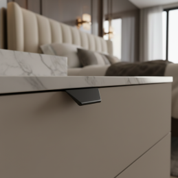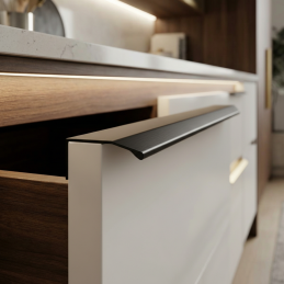Die moderne Kanten-Griffleiste MAURA in der Ausführung schwarz matt ist ein elegantes und markantes Element für zeitgemäße Innenräume. Das minimalistische Profil zur Montage an der oberen Kante der Türen sorgt für ein sauberes, ungestörtes Erscheinungsbild der Möbel ohne klassische, hervorstehende Griffe.