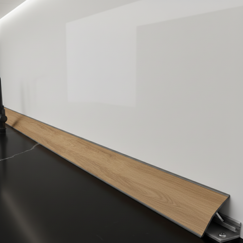 Sie besteht aus zwei Teilen – der untere Teil wird verschraubt oder geklebt auf die Arbeitsplatte und der obere wird anschließend eingeklickt in den unteren Teil. Das Ergebnis ist ein sauberer, stabiler und einheitlicher Abschluss im gleichen Dekor wie die Arbeitsplatte.