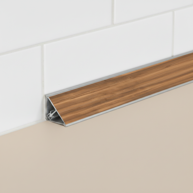 Sie besteht aus zwei Teilen – der untere Teil wird auf die Arbeitsplatte geschraubt oder geklebt und der obere anschließend eingeklickt in den unteren. So entsteht ein fester, präziser und harmonischer Abschluss im gleichen Dekor wie die Arbeitsplatte.