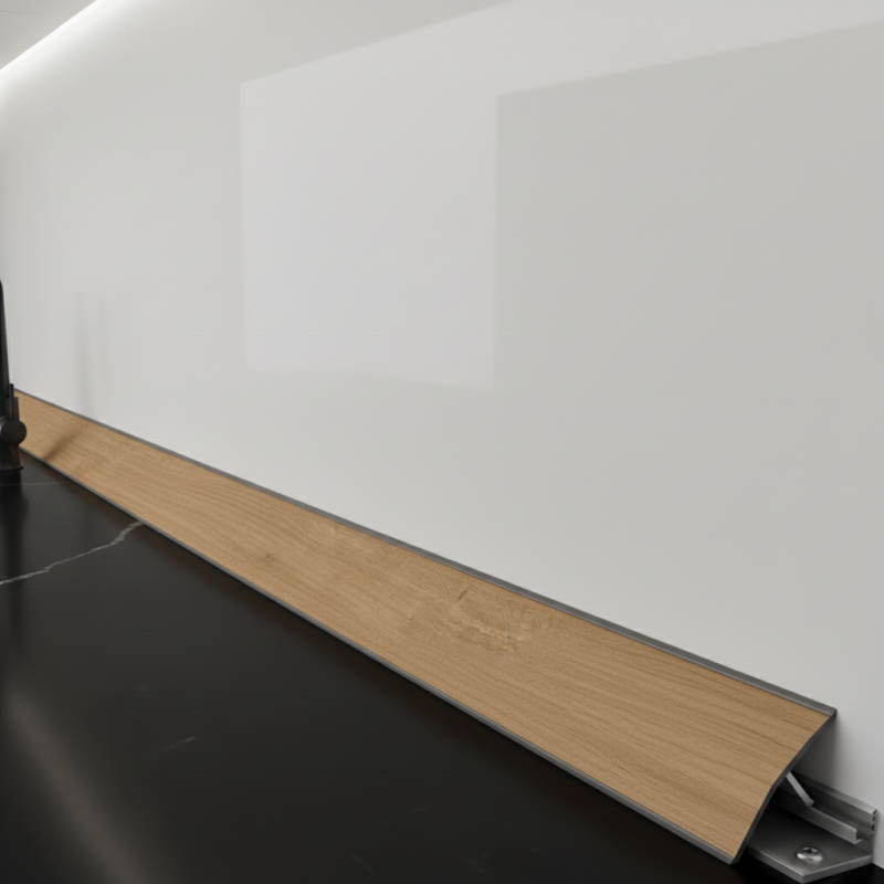 Sie besteht aus zwei Teilen – der untere Teil wird angeschraubt oder geklebt auf die Platte und der obere wird anschließend eingeklickt in den unteren Teil, wodurch ein sauberes und ästhetisches Finish im gleichen Dekor wie die Arbeitsplatte entsteht.