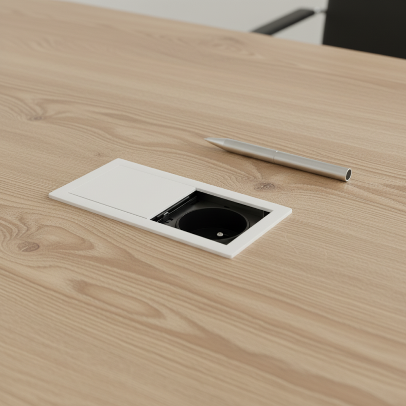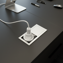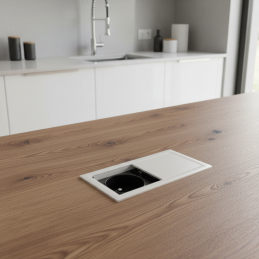 Elegante Einbausteckdose VersaHit Mono im reinen weißen Design ist eine moderne und praktische Lösung für Küchen, Arbeitsplatten, Büroräume und Wohnmöbel. Sie ermöglicht einen komfortablen Zugang zum Strom ohne störende Elemente auf der Oberfläche und bewahrt den Minimalismus des Interieurs.